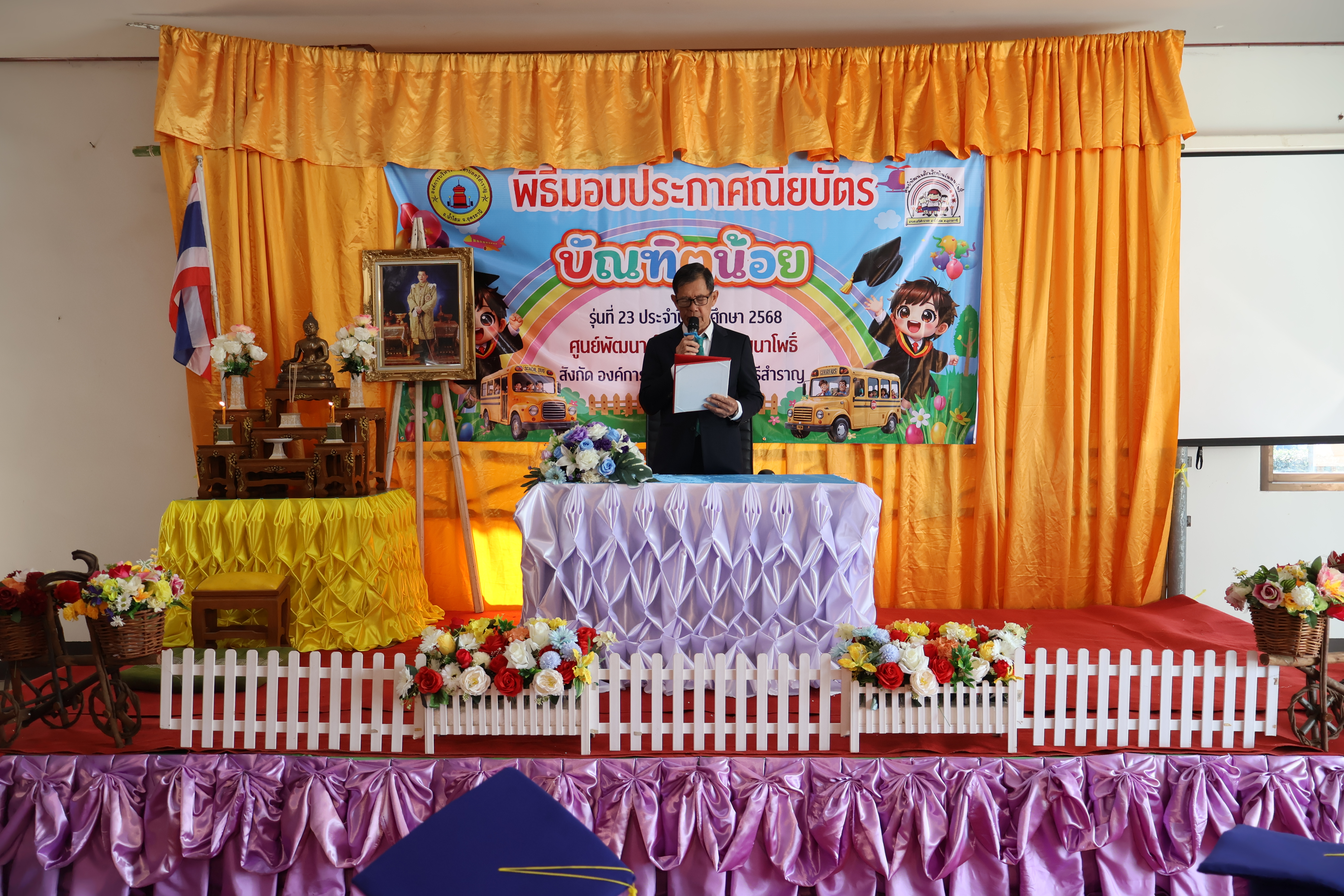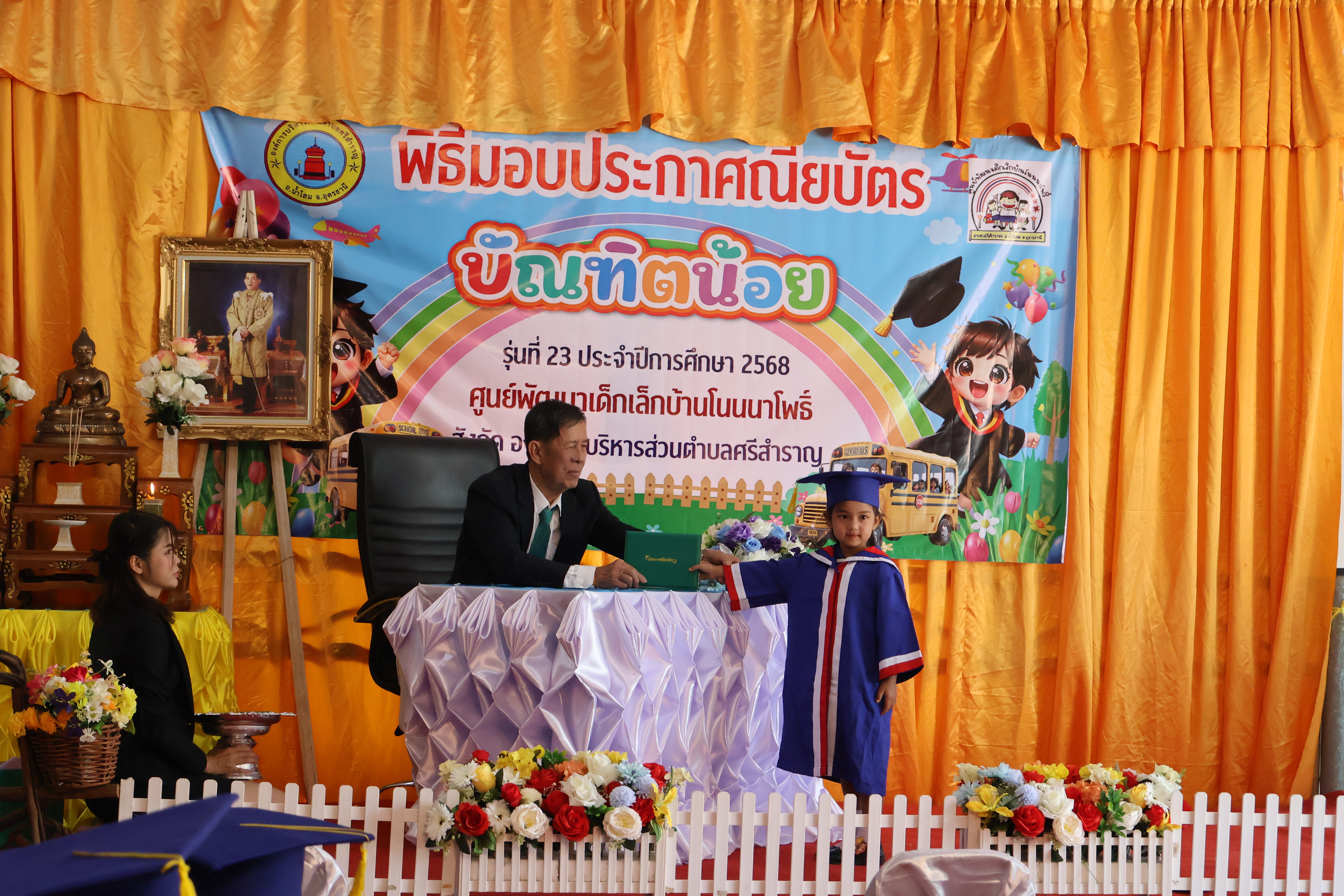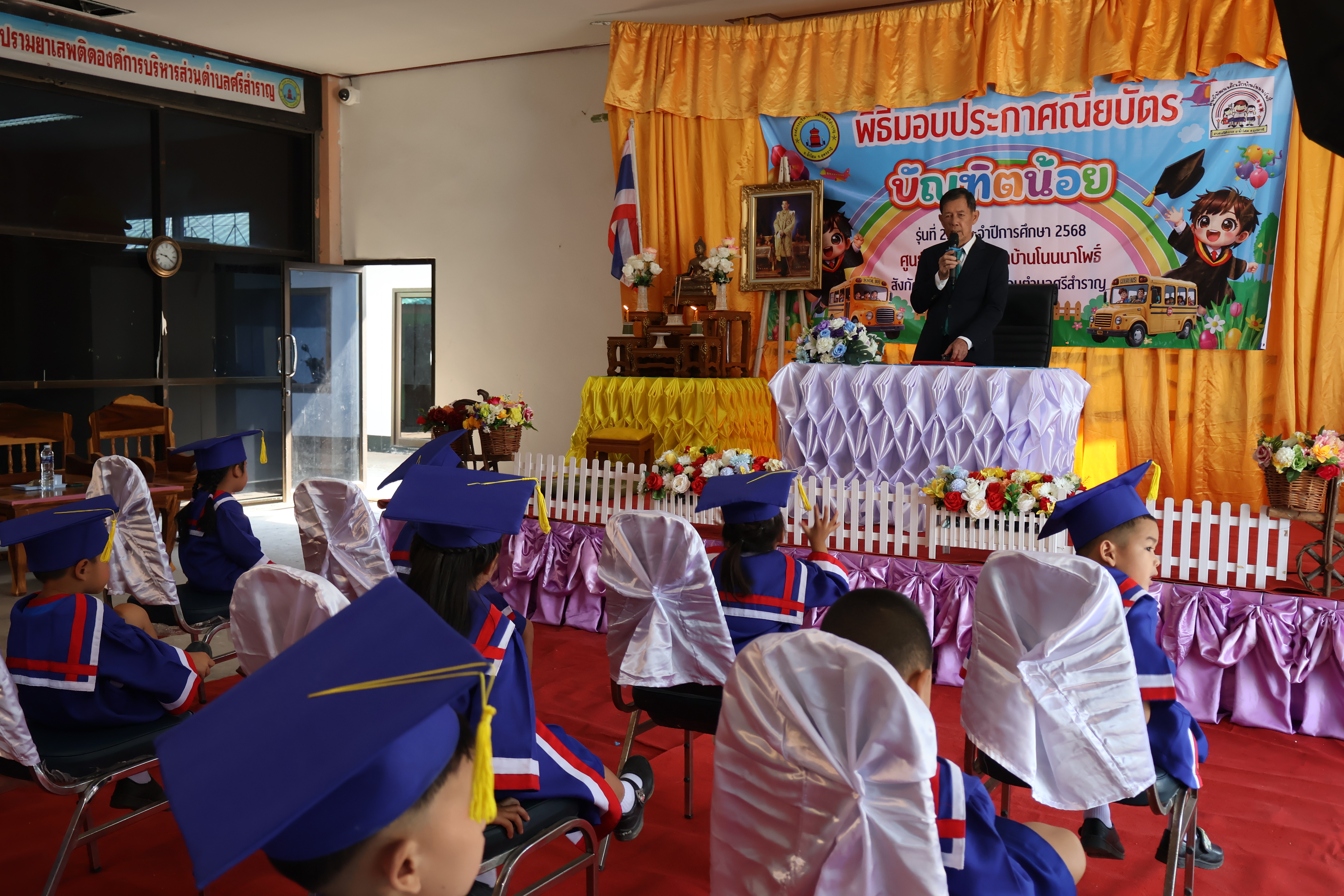 นายจำรัส อำพันทอง นายกองค์การบริหารส่วนตำบลศรีสำราญ ได้เข้าร่วม โครงการ "บัณฑิตน้อย" ประจำปีการศึกษา 2568 ศูนย์พัฒนาเด็กเล็กบ้านโนนนาโพธิ์ สังกัด สำนักปลัดองค์การบริหารส่วนตำบลศรีสำราญ เพื่อมอบวุฒิบัตรนักเรียนที่ได้ผ่านการเตรียมความพร้อมระดับก่อนประถมศึกษา ให้นักเรียนเกิดความภาคภูมิใจ และเห็นความสำคัญของการเป็นนักเรียนในครั้งแรกก่อนที่จะเติบโตเป็นผู้ใหญ่ในอนาคต