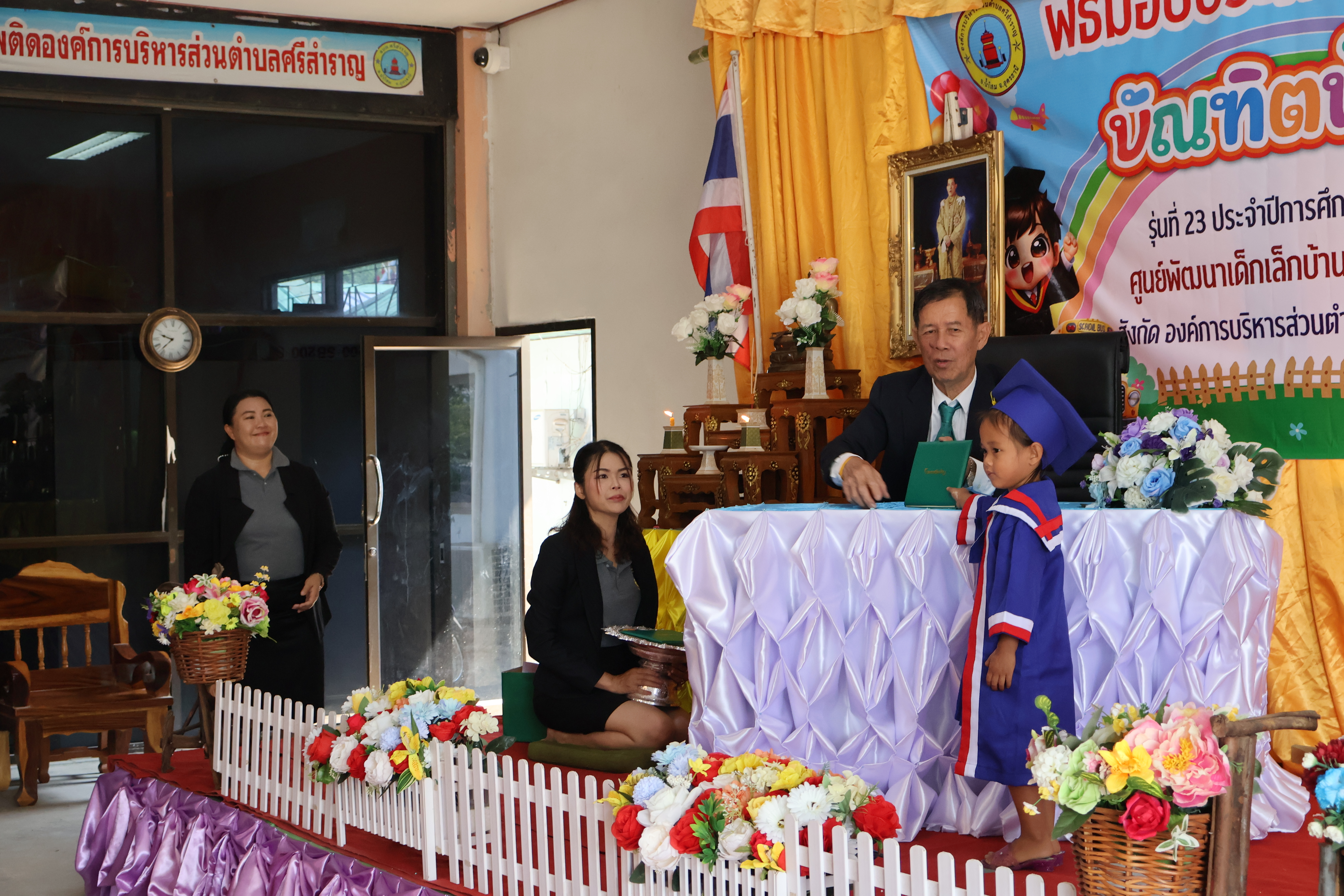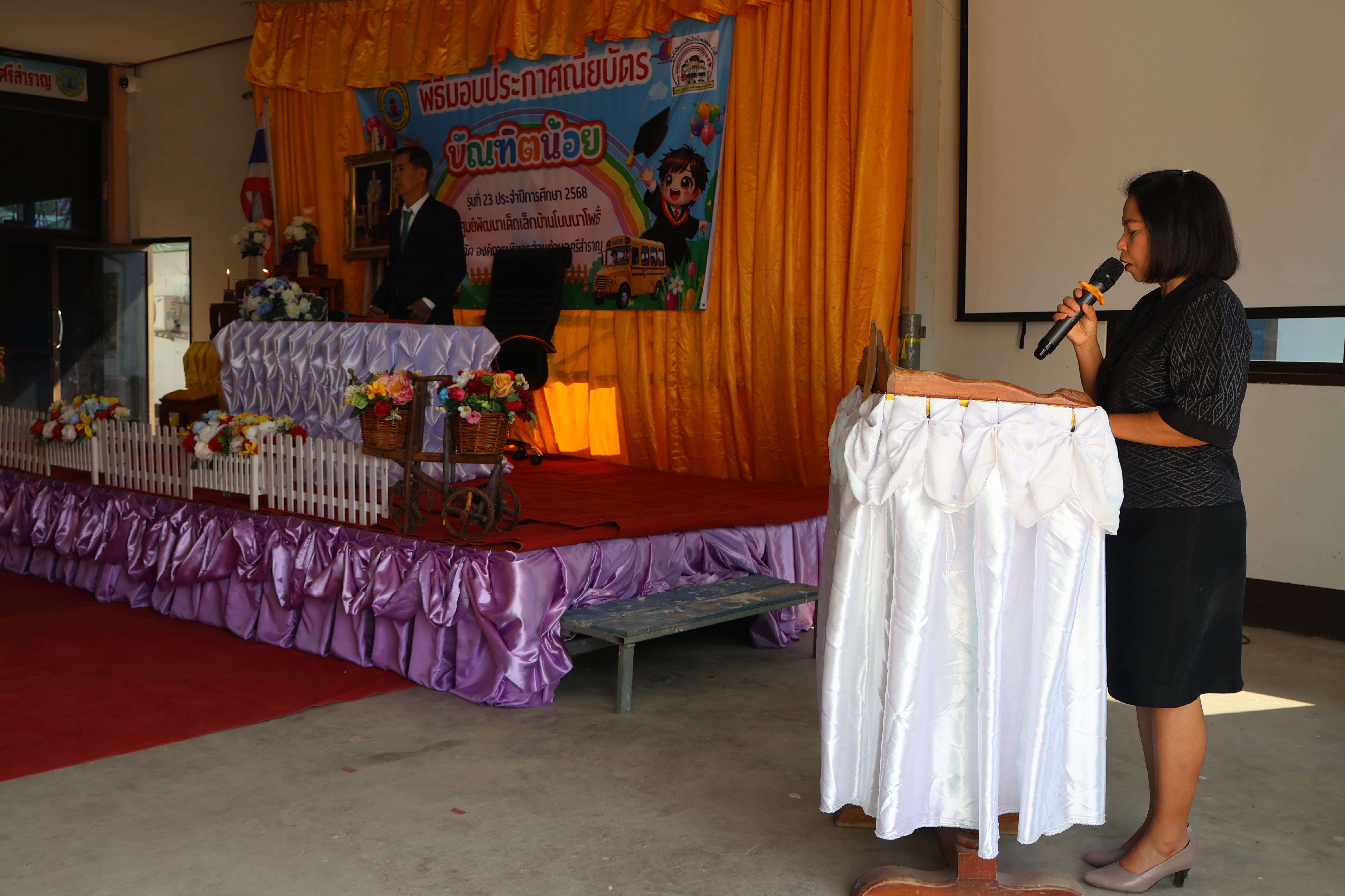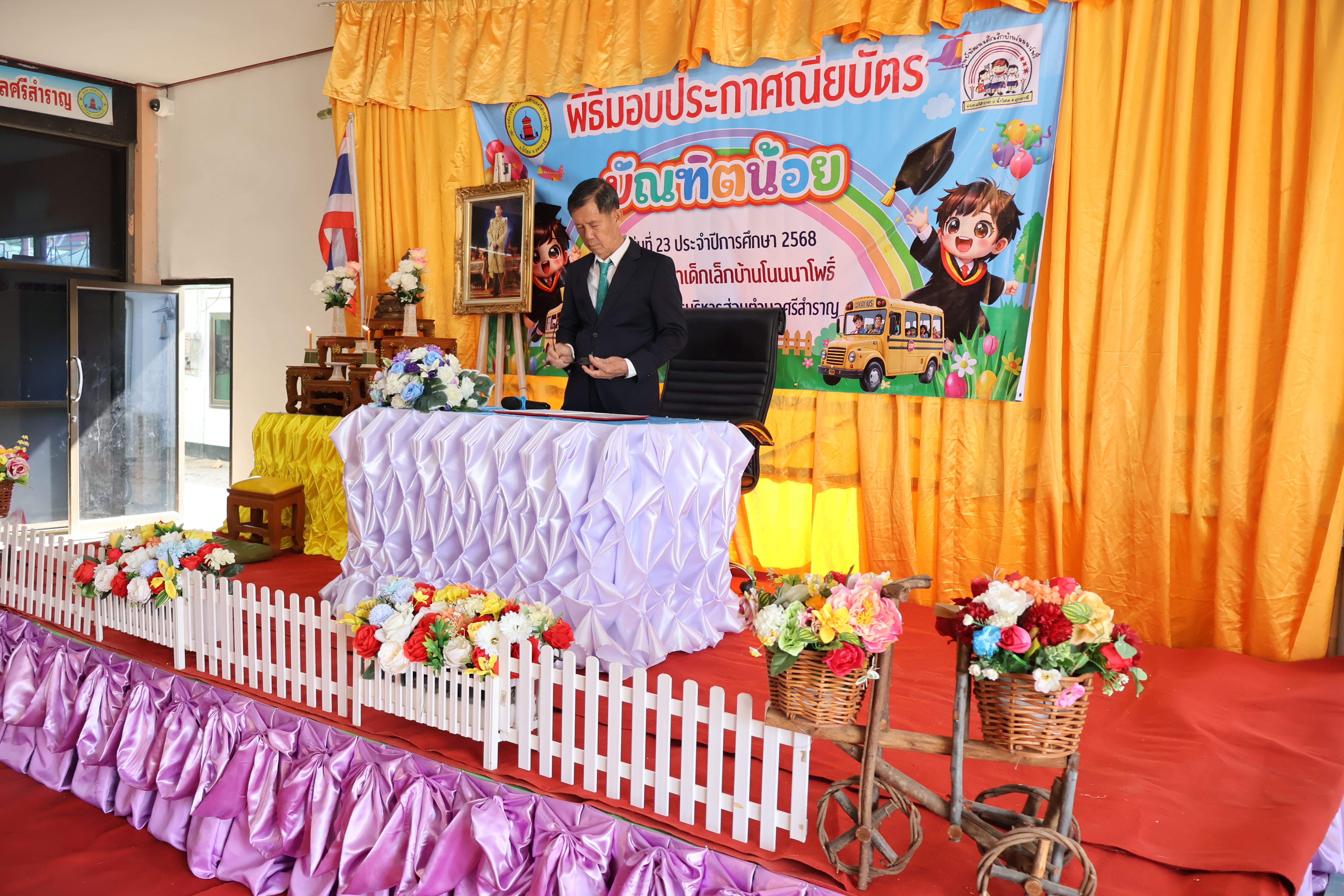 นายจำรัส อำพันทอง นายกองค์การบริหารส่วนตำบลศรีสำราญ ได้เข้าร่วม โครงการ "บัณฑิตน้อย" ประจำปีการศึกษา 2568 ศูนย์พัฒนาเด็กเล็กบ้านโนนนาโพธิ์ สังกัด สำนักปลัดองค์การบริหารส่วนตำบลศรีสำราญ เพื่อมอบวุฒิบัตรนักเรียนที่ได้ผ่านการเตรียมความพร้อมระดับก่อนประถมศึกษา ให้นักเรียนเกิดความภาคภูมิใจ และเห็นความสำคัญของการเป็นนักเรียนในครั้งแรกก่อนที่จะเติบโตเป็นผู้ใหญ่ในอนาคต